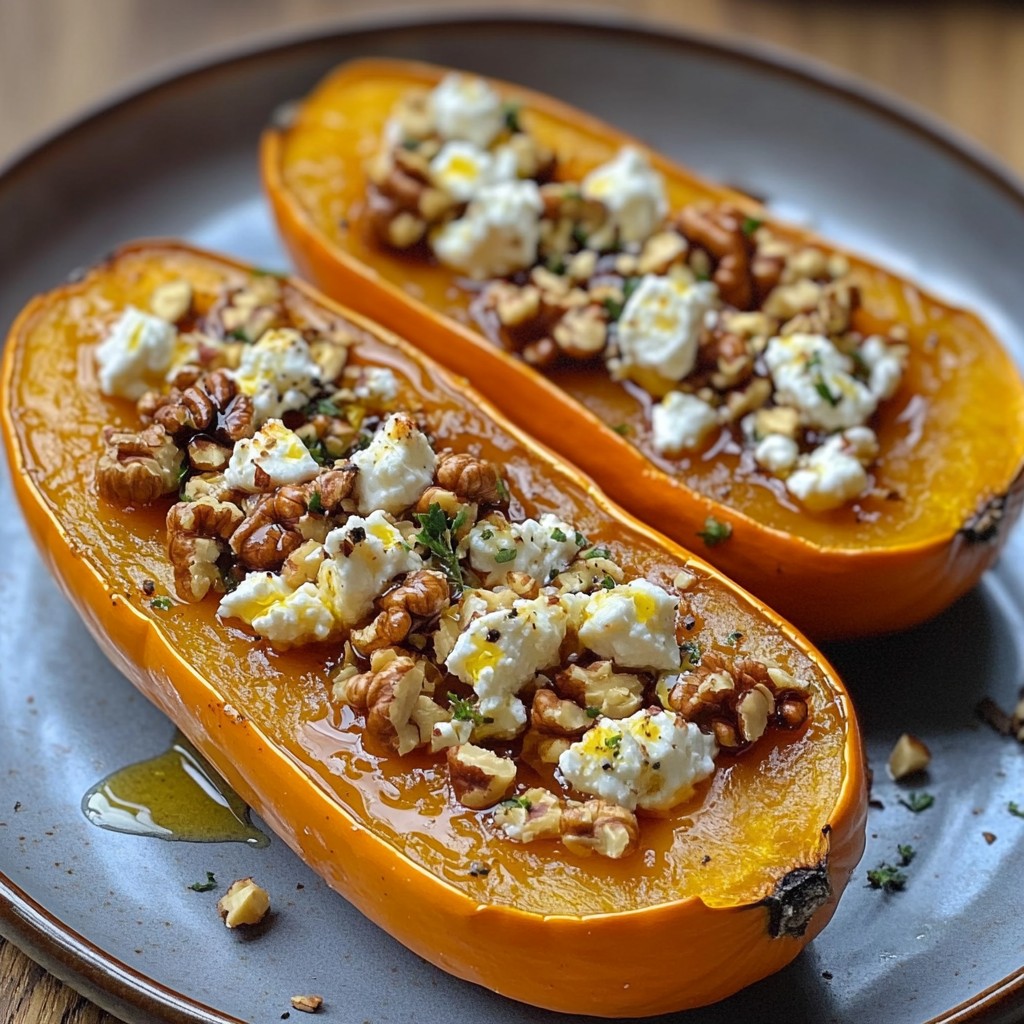 Finition gourmande : Sortez la courge du four. Parsemez immédiatement la chair fondante de feta et de noix. Arrosez d’un filet de jus de citron et d’une pincée de piment d’Espelette (si vous l’utilisez).